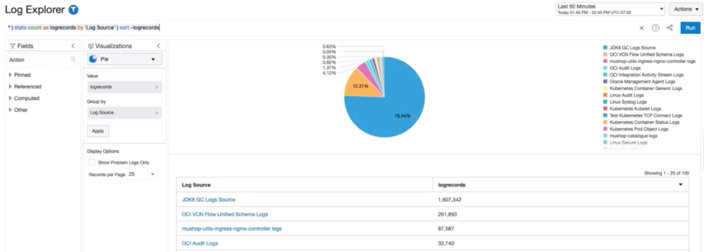 When you run this query in OCI Logging Analytics, you’ll see a structured table of log sources ranked by the number of log records.